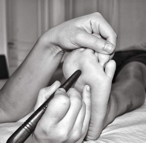 Méthode de thérapie manuelle pour agir indirectement sur un organe ou sur certaines parties du corps, par une simple pression sur les zones dites réflexes du pied.
